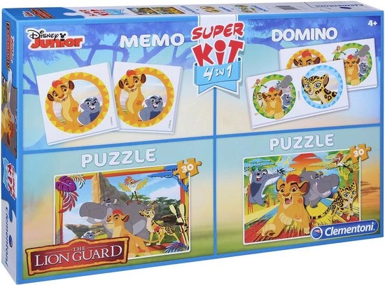 Deze Clementoni Superkit 4 in 1 – The Lion Guard bestaat uit 2 puzzels van 30 stuks, 1 spel Memory, 1 spel Domino.