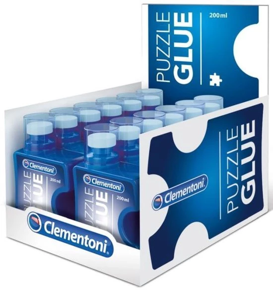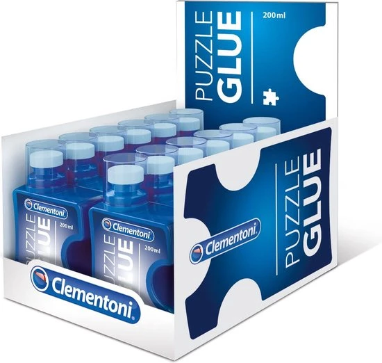 Puzzellijm 200 ml. Met Clementoni-lijm kunnen puzzels worden opgelost en opgehangen. De afbeelding is verzegeld om de kleurschittering permanent te beschermen. De lijm is klaar voor gebruik, wordt rechtstreeks met een spons aan de fles aangebracht en moet gelijkmatig over het oppervlak van de afbeelding worden verdeeld. Sneldrogend, na slechts een uur is de puzzel klaar om op te hangen.