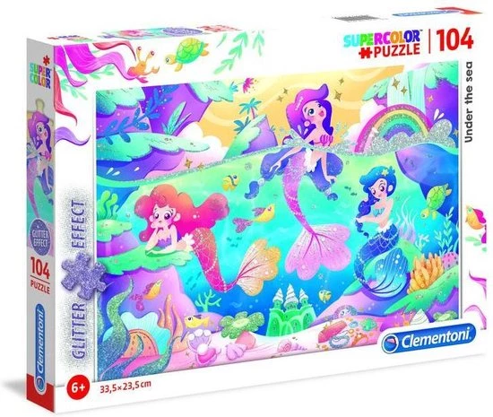 Puzzel 104 Glitter Under The Sea104 delige legpuzzel met een afmeting 33,5 x 23,5 cm. De Glitter puzzelcollectie heeft een speciaal glitter kleureffect op de doos en op de puzzel! Deze puzzels zijn speciaal ontwikkeld voor kinderen en leverbaar in de meest aansprekende en geliefde karakters. Boeiende afbeeldingen met heldere glanzende kleuren. Deze puzzels helpen het observatievermogen, logica en manuele vaardigheid van het kind te bevorderen. De kwalitatief volle materialen en de exclusieve printtechniek staan garant voor levendige en heldere afbeeldingen. Gemaakt in Itali?.