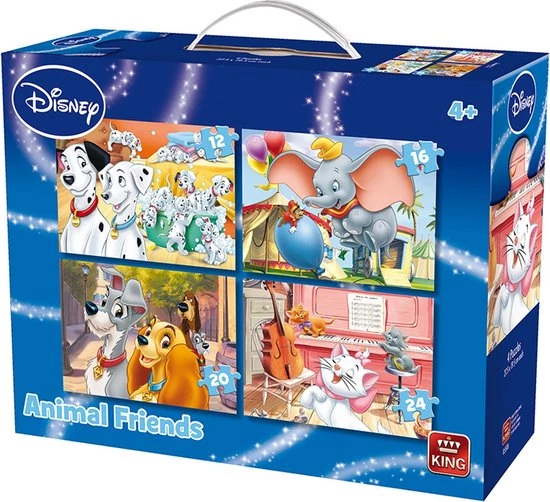 Deze koffer is gevuld met 4 puzzels met verschillende puzzelplaten met bekende Disney dieren. Waaronder de 101 Dalmatiers, Aristokatten en Dombo. In de koffer zitten puzzels in verschillende stukjes, namelijk 12, 16, 20 en 24 stukjes.