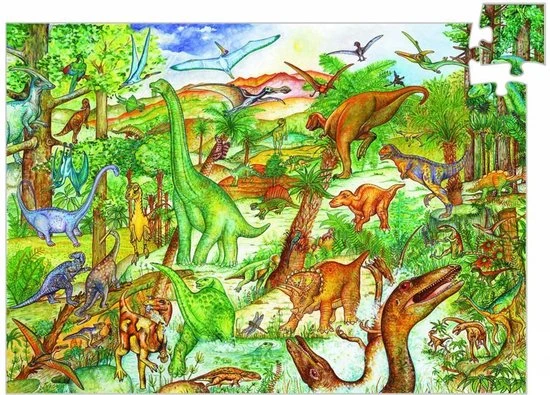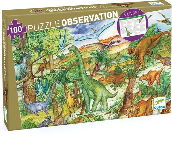 De observatiepuzzel Dinosaurus van Djeco is een lastige puzzel van 100 kartonnen stukjes voor iedereen die dol is op deze prehistorische dieren. Maak de puzzel en lees in het boekje de uitleg over wat voor soorten dino’s je allemaal in de puzzel kunt vinden.