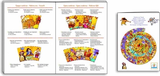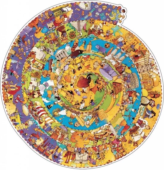 De spiraal des tijds, van de prehistorische dag tot vandaag! Een grote puzzel van Djeco van 350 stukjes, boordevol details en een naslagboekje met