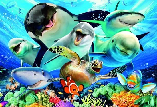 3, 2, 1, Smile!!! Een grappige onderwater selfie van allen zeedieren. De orka, de haai, de schildpad, de dolfijn, ja, zelfs Nemo is van de partij! Dankzij de gratis puzzellijm die al mee in de verpakking zit, kan je de puzzel nadien gemakkelijk vastlijmen!