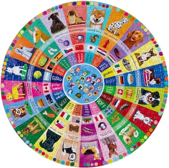 Dogs of the World 500-delige ronde puzzel voor volwassenen zal ieders staart doen kwispelen! Twintig verschillende hondenrassen van over de hele wereld komen voor in deze familiepuzzel. Elk ras heeft zijn eigen kleurstrook met de naam van het ras, de vlag van zijn geboorteland, hoe je “inslag” of “guau” zegt in de taal van dat land. Plus, een ring die alle dingen laat zien waar honden graag mee spelen, gebruiken of achtervolgen… Een pantoffel, een bal, een eekhoorn en nog veel meer. Laat de kinderen de stukjes op kleur sorteren en maak vervolgens elk onderdeel samen als een gezin af. Een perfect cadeau voor een hondenliefhebber!