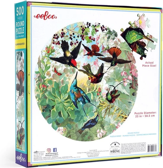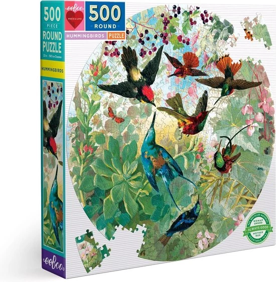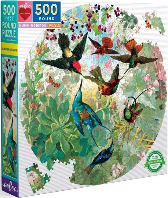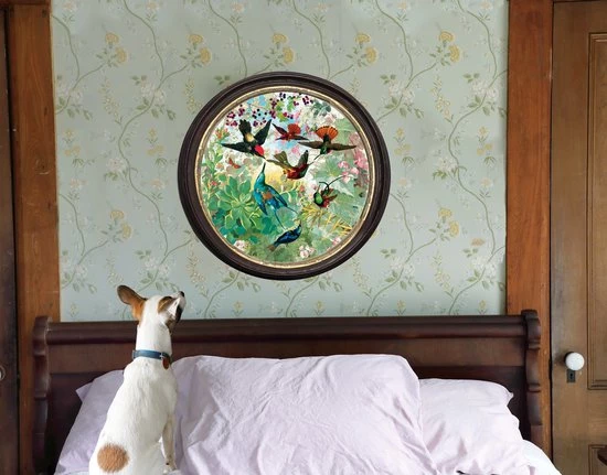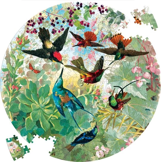 Ronde puzzel met een diameter van 58,5 cm. Deze plaat is geschikt om met meerdere mensen tegelijk, van verschillende kanten, te puzzelen. Ga de uitdaging van een ronde legpuzzel aan. Ge?nspireerd op vintage illustraties met vogels. Deze prachtige tuin vol kolibries in vlucht zal elke familie van puzzelaars in gefocuste rust brengen.
