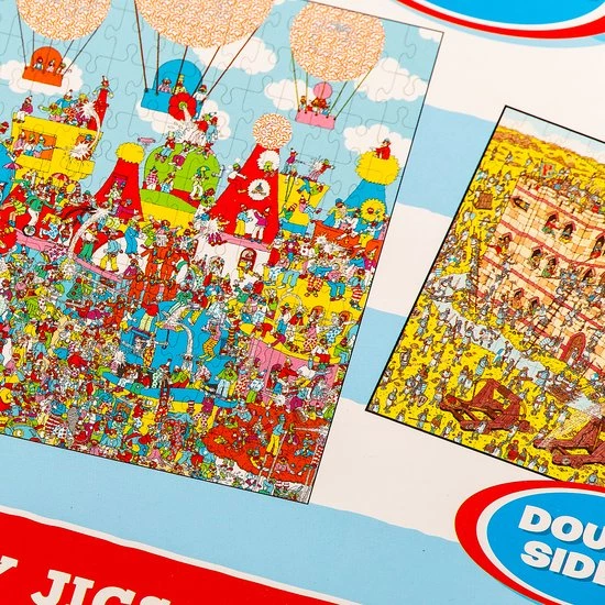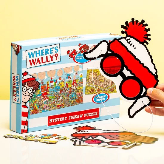 Where?s Wally mysterieuze puzzel van Fizz. Dubbelzijdig bedrukte puzzel, die verborgen afbeeldingen heeft. Met de twee speciale maskers worden de verborgen afbeeldingen zichtbaar. De Where?s Wally Mystery Puzzle bestaat uit 250 stukjes en zorgt voor uren speelplezier. Dit is een officieel gelicenseerd Where?s Wally product.