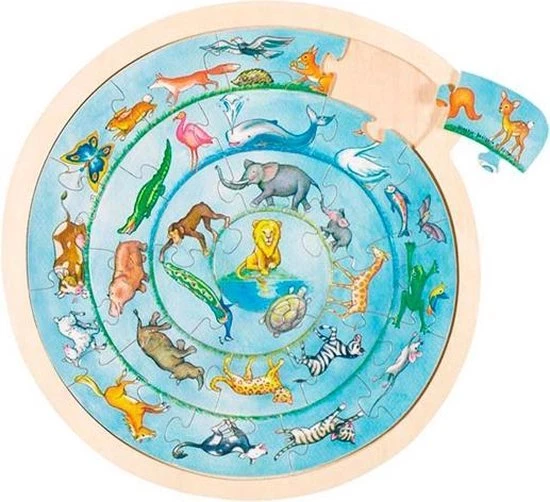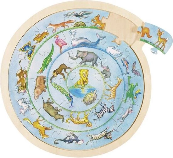 Puzzel uw eigen dierencirkel bij elkaar! Maak de puzzel compleet en uw ziet een spiraal met vele verschillende dieren. De puzzel is gemaakt van hout en is 27-delig.