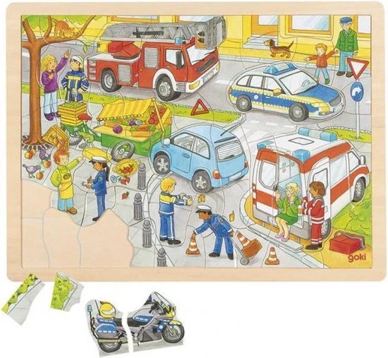 Goki Politie vormenpuzzel Wat is hier gebeurd? Reden genoeg om de puzzel te maken! De moeilijkheidsgraad komt overeen met een puzzel van zesennegentig stukjes, omdat de vorm van de stukjes bewust is ontworpen om wat uitdagender te zijn in deze goki-puzzel. Specificaties: Kleur: multicolor Geslacht: junior Materiaal: hout Afmetingen: 40 x 30 x 1 cm (lxbxd) Leeftijd: vanaf 4 jaar Inhoud: 56 Stukjes