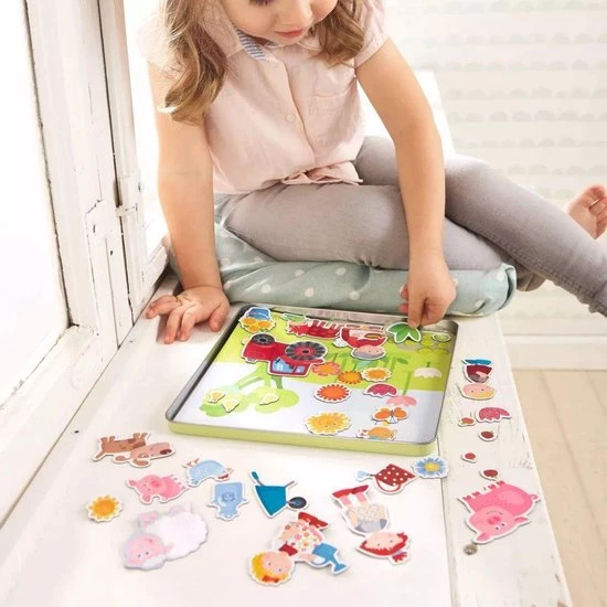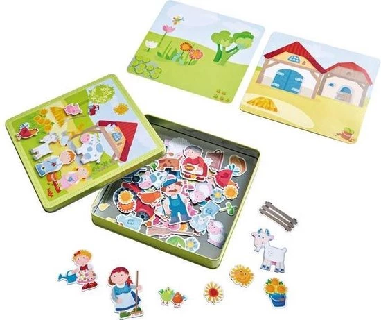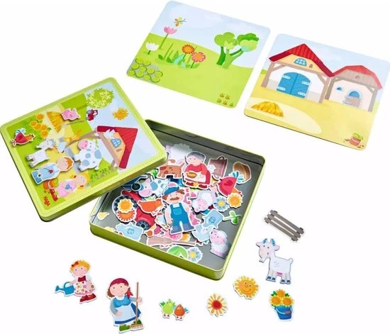 Deze magnetische spelset van HABA zit vol plezier voor boerderij fans: verschillende boerderijbewoners, dieren en planten en verschillende achtergrondscenes! Deze magnetische speelset wakkert de creativiteit en verbeelding van kinderen aan. Uw kleintjes zullen het fantastisch vinden om Peter, Pauline en hun vriendjes uit te nodigen en het leven op de boerderij na te spelen. Met verschillende scenes en verschillende personages om uit te kiezen, kunnen de kleine boeren urenlang plezier maken. Met 122 stukjes en 4 achtergrondsc?nes die worden geleverd in een stevige metalen doos is deze magnetische speelset bijzonder geschikt om uw kinderen onderweg bezig te houden.