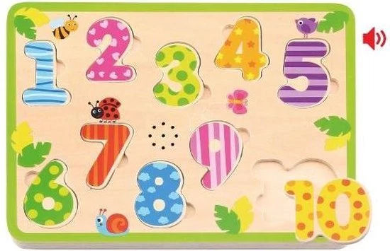 Houten puzzel met 10 stukken van 1 tot 10 met verschillende geluiden. Leg het stukje op de juiste plek en hoor het juiste getal (in Engels). Gemaakt met felle en frisse kleuren die al je aandacht trekken. Leer tellen van 1 tot 10 in het Engels, terwijl je aan je concentratie en oog-handco?rdinatie werkt.