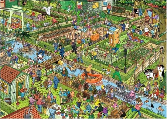 De volkstuintjes van Jan van Haasteren zijn zeker niet saai! Jan van Haasteren zorgt ervoor dat er van alles gebeurt in deze volkstuintjes.
