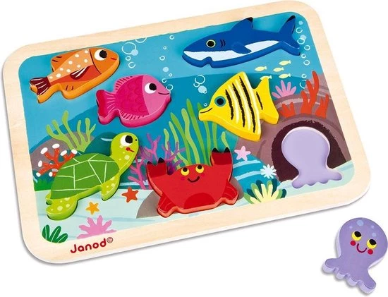 | Verpakkingsinhoud | 1, x, Janod, Puzzel, met, 7, losse, onderwater, dieren. |
