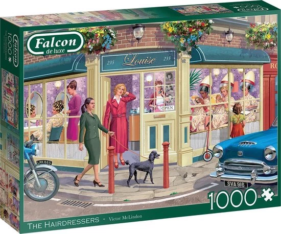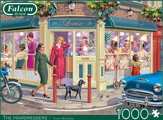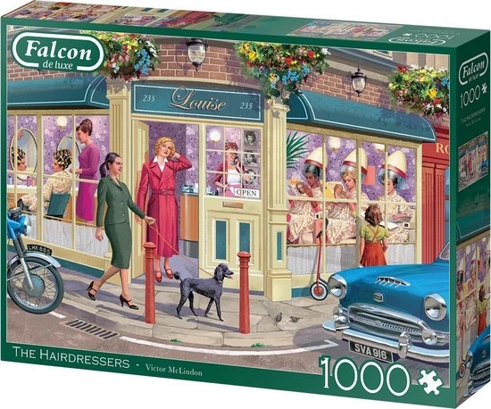 The Hairdressers doen hun werk goed in dit mooie dorpje van de Falcon legpuzzel. Het is een gedetailleerde afbeelding met The Hairdressers op de achtergrond. De bezoekers zitten in de kapperstoel te wachten totdat ze weer met een frisse coupe naar huis kunnen. Duik in de wereld van deze Falcon puzzel en zie stukje voor stukje The Hairdressers tot leven komen. De puzzel bestaat uit 1000 stukjes, is gemaakt van karton en heeft een afmeting van 68 x 50 cm.