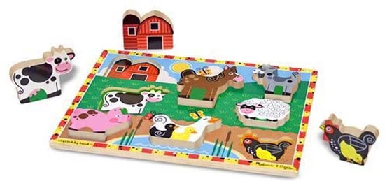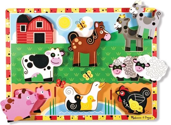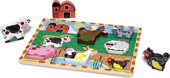 Geniet van de boerderij met deze extradikke houten puzzel. De puzzel bevat zeven eenvoudig vast te pakken, extradikke boerderijdieren en een schuur. Elk stuk heeft een meerkleurige, bijpassende afbeelding eronder. De schuur en de dierenstukken kunnen rechtop worden gezet voor fantasierijk spelen. Moedigt de hand-oogco?rdinatie, fijne motoriek en creatieve expressie aan.