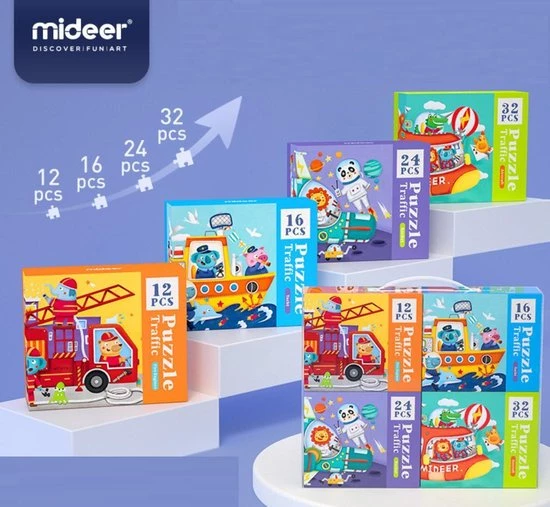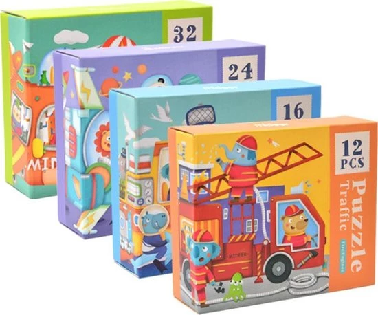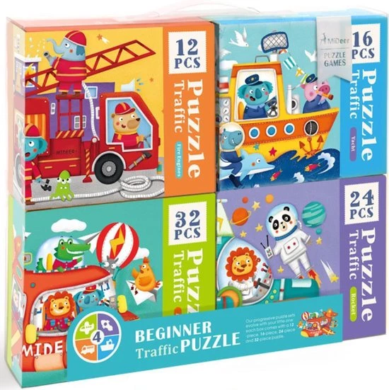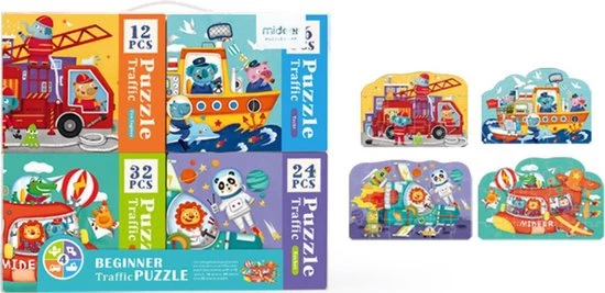 MiDeer – 4-in-1 Puzzels In Mooie Geschenkdoos – 12 + 16 + 24 + 35 Extra Grote Puzzelstukjes – Vervoer & Dier: Brandweerwagen + Boot + Vliegtuig + Raket – Kinderpuzzel – Educatief Speelgoed Voor Kinderen