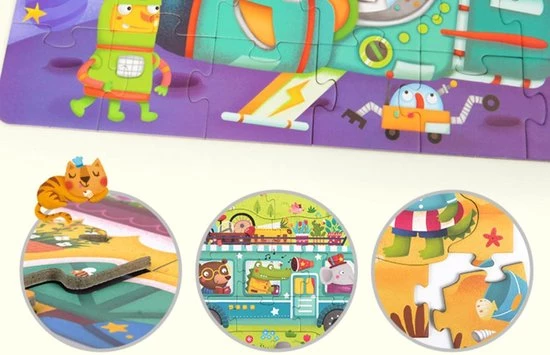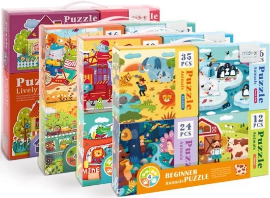 Deze fantastische puzzelset is een leuke bezigheid voor de gehele familie. Verbetert de hand-oog co?rdinatie, motorische vaardigheden en probleemoplossend vermogen van kinderen. Bestaat uit extra grote puzzelstukken. Het zijn 4 aparte puzzels met 12 – 16 – 24 – 35 stukjes. De mooie verpakking maakt het ook een perfect geschenk. De puzzelstukjes zijn goed schoon te houden en dat houdt de puzzel als nieuw. Let op: Als u bij ViKids Global Toys een bestelling plaatst voor meer dan 50 euro, krijgt u een gratis cadeautje.