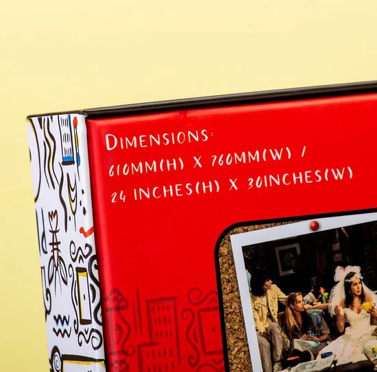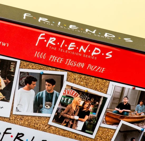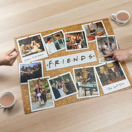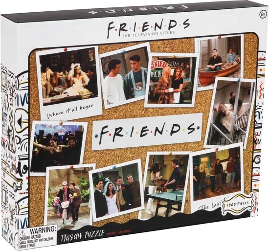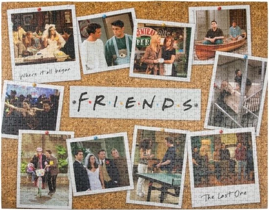 Puzzel 1000 stukjes van Friends. Legpuzzel bestaande uit duizend stukjes, met afbeeldingen van verschillende scenes uit Friends. Op de puzzel staat Ross met zijn bank, Phoebe die fietsles krijgt en Monica en Rachel in hun trouwjurk. Voor de echte Friends fan. Dit is een officieel gelicentieerd Friends product.