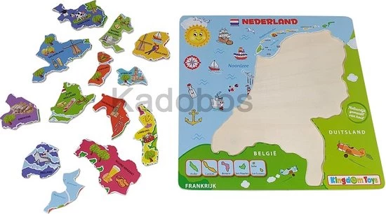 2x educatieve puzzel vna Nederland. De puzzels worden geleverd in een houten frame en toont de kaart van Nederland. De ene puzzel heeft plaatsnamen en de namen van de rivieren. De andere puzzel heeft specifieke afbeeldingen per provincie. Zo leer je spelenderwijs meer informatie over je eigen land.