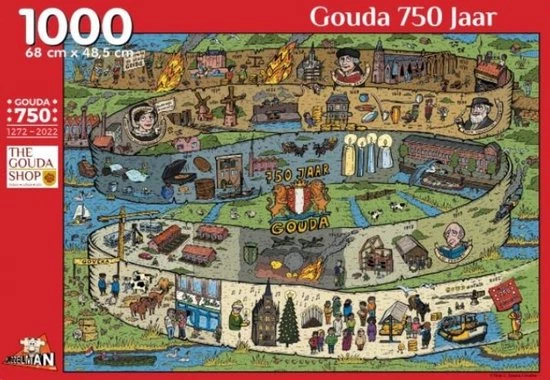 In aanloop naar het jaar waarin we de 750e verjaardag van Gouda vieren, is er al weer een nieuwe puzzel getekend door Thijs Jansen. Leg in 1000 stukjes de 750 jaar aan Goudse geschiedenis aan elkaar en je komt echt van alles tegen.