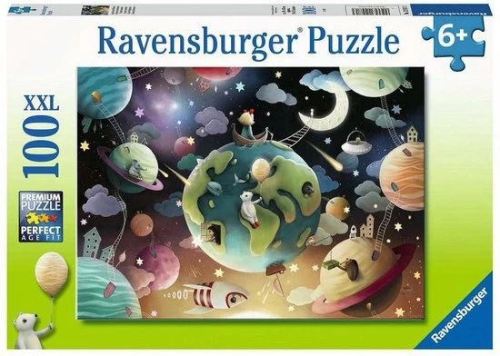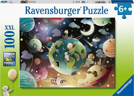 Ontsnap uit de realiteit en stap in de wereld van Ravensburger puzzels. Tijdens het puzzelen ontdekken kinderen hun grootse vaardigheden. XXL- puzzels voor XXL- puzzelplezier. De XXL-grote puzzelstukken zijn eenvoudiger te leggen. Het resultaat is een kunstwerk op posterformaat dat in geen enkele kinderkamer misstaat. Dankzij de met de hand gemaakte stansmessen is de vormvariatie van de stukjes oneindig. Kinderen vanaf 6 jaar zullen genieten van de Fantasie planeten puzzel met 100 stukjes met als thema De Ruimte