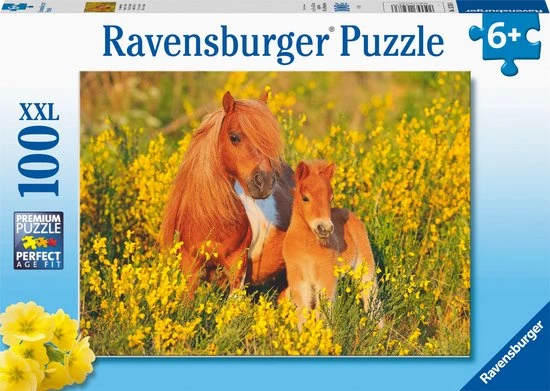 XXL-puzzels voor XXL-puzzelplezier. Kinderen vanaf 6 jaar zullen genieten van de Shetland pony??s puzzel met 100 stukjesOntsnap uit de realiteit en stap in de wereld van Ravensburger puzzels. Tijdens het puzzelen ontdekken kinderen hun grootse vaardigheden. XXL- puzzels voor XXL- puzzelplezier. De XXL-grote puzzelstukken zijn eenvoudiger te leggen. Het resultaat is een kunstwerk op posterformaat dat in geen enkele kinderkamer misstaat. Dankzij de met de hand gemaakte stansmessen is de vormvariatie van de stukjes oneindig. Kinderen vanaf 6 jaar zullen genieten van de Shetland pony?s puzzel met 100 stukjes.Stukjes zoeken, aan elkaar passen, tevreden kijken naar het steeds grotere motief- puzzelen betekent het ene succes na het andere opbouwen. Daarom vinden kinderen het geweldig om met de puzzelstukjes altijd opnieuw hun favoriete motieven samen te stellen. Maar puzzels zorgen niet alleen voor plezier: in de juiste moeilijkheidsgraad kunnen kinderen van elke leeftijd uitdagingen leren aangaan, hun geduld oefenen en hun zelfvertrouwen vergroten. Ongetwijfeld vindt elk kind iets naar wens in de ruime keuze van Ravensburger-kinderpuzzels met prachtige motieven, van 2 tot 300 puzzelstukjes. De keuze van de juiste motieven en de uitstekende kwaliteit van onze kinderpuzzels liggen ons na aan het hart. Daarom wordt de geschiktheid van alle materialen door een onafhankelijk instituut bevestigd. Al meer dan 100 jaar ontwikkelen we puzzels, die kinderen leuk vinden: motief, aantal en grootte van de puzzelstukjes zijn aan hun leeftijd aangepast.