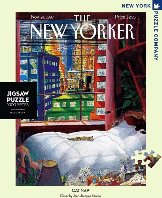 Op deze puzzel van New York Puzzle Company is een omslag te zien van de New Yorker waarop een gestreepte kat zich uitrekt op een groot wit bed voor een industrieel raam in een zonnig maar rommelig appartement in New York City.