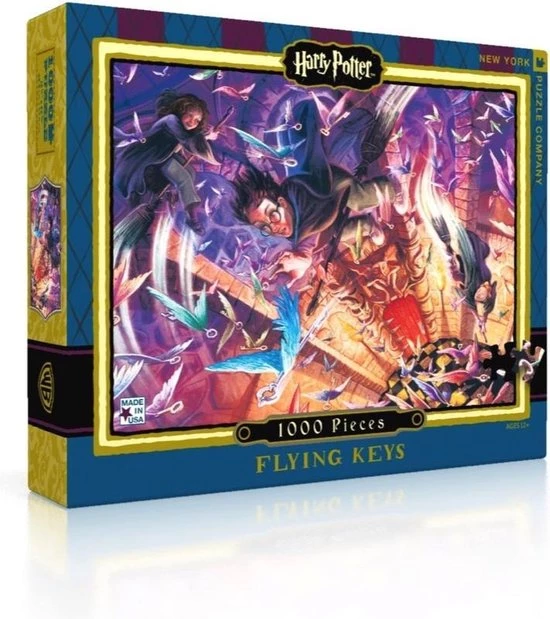 Harry Potter 1000 stukjes van New York Puzzle Company. Legpuzzel waarop Harry Potter tussen de vliegende sleutels vliegt. De puzzel bestaat uit duizend stukjes en is ge?llustreerd door Mary GrandPr?. Dit is een officieel gelicenseerd Harry Potter Afmeting complete puzzel: 67 x 49 centimeter.