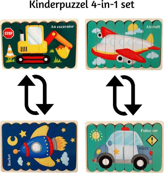 Van Theo Houten Puzzel – Dubbelzijdige Kinderpuzzels – Set 4-in-1 – Montessori Speelgoed – Set Voertuigen