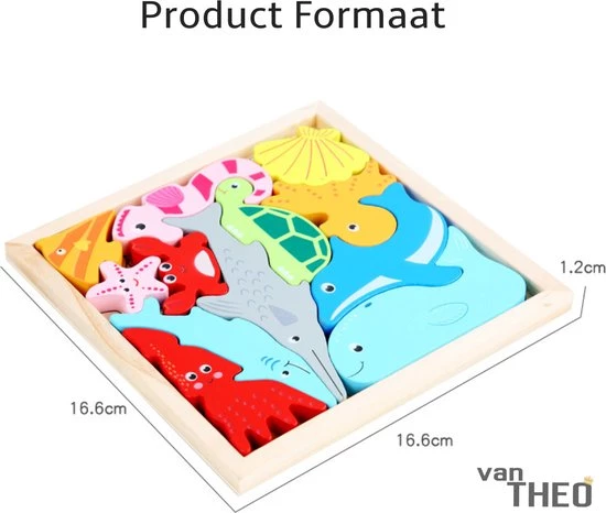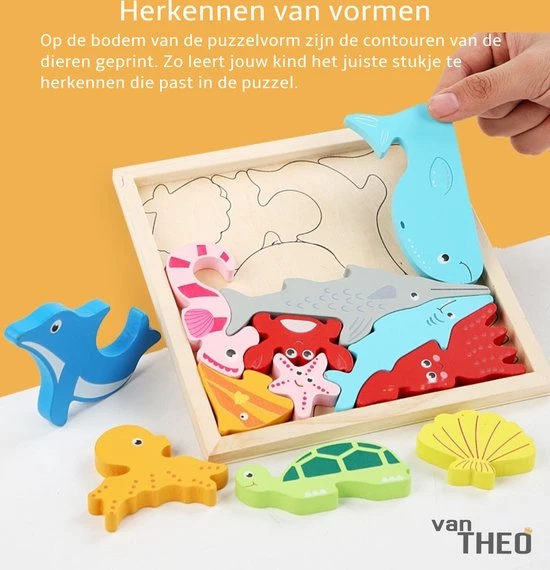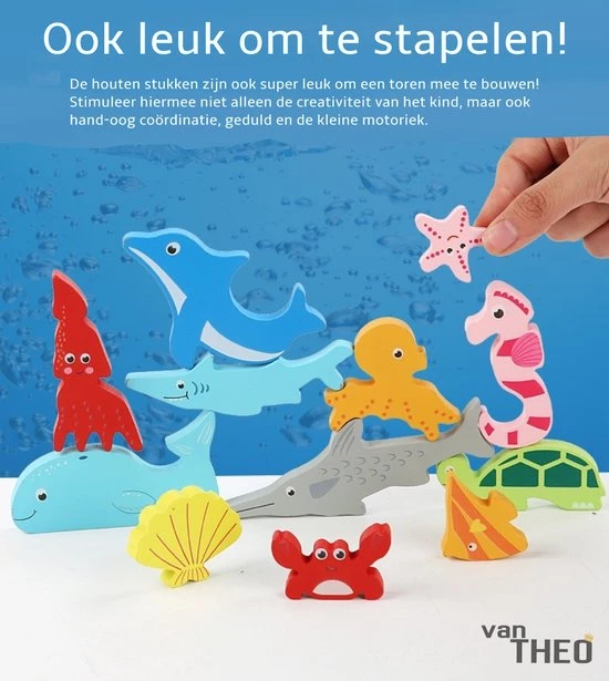 De set bestaat uit leuke houten dieren in allerlei verschillende kleuren. Een uitdagend spel dus waarmee geoefend wordt met het herkennen van kleuren, vormen en ruimtelijk inzicht. Ook leert het kind met dit spel de namen van verschillende dieren uit de zee.